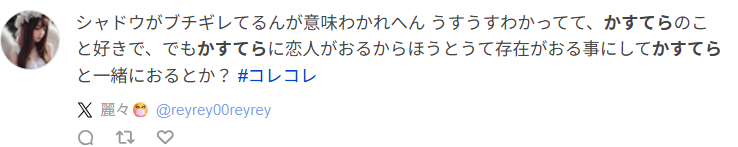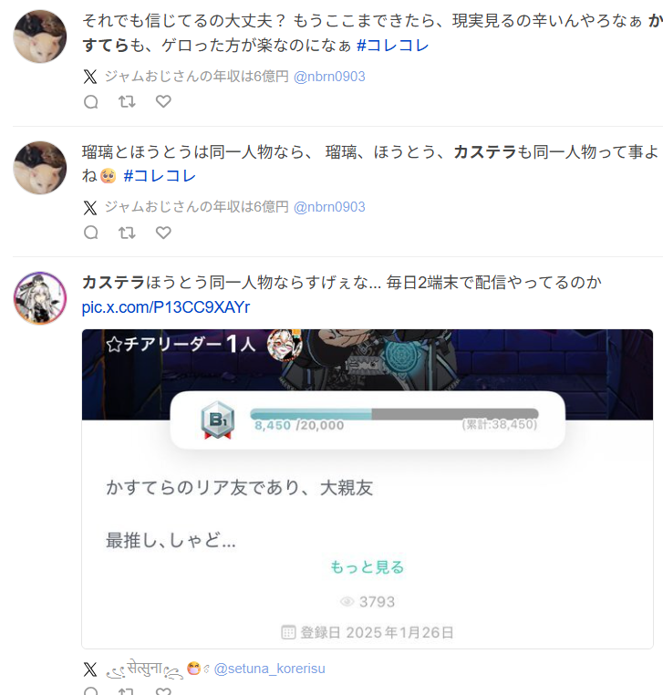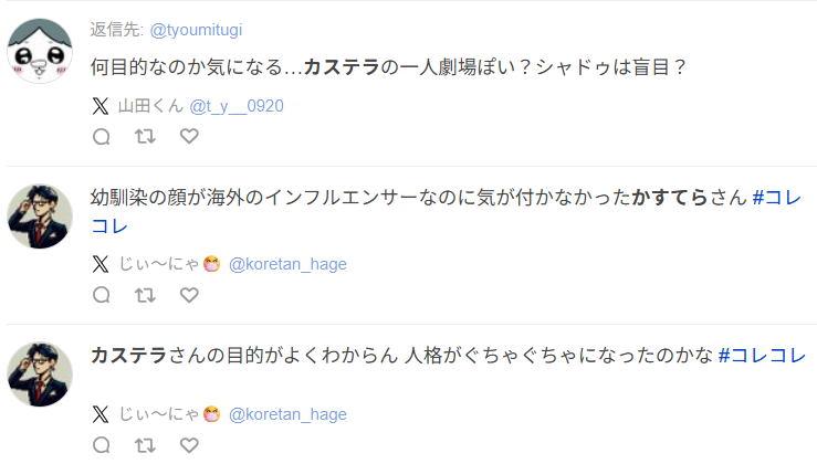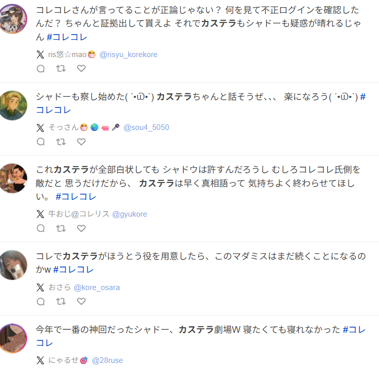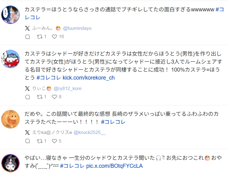 SNS上で、ユーザーが「カステラ」と「ほうとう」の関係性について議論している様子が伺えます。カステラとほうとうは同一人物であるという説が浮上し、ユーザーは様々な憶測や推測を投稿しています。また、シャドウという人物もこの議論に関わっており、カステラとシャドウの関係性についても注目が集まっています。