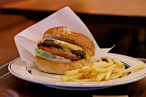 ベジフィリーチーズステーキバーガーが二重に肉がのっていて、野菜はレタスとトマトがとても新鮮にのっています。